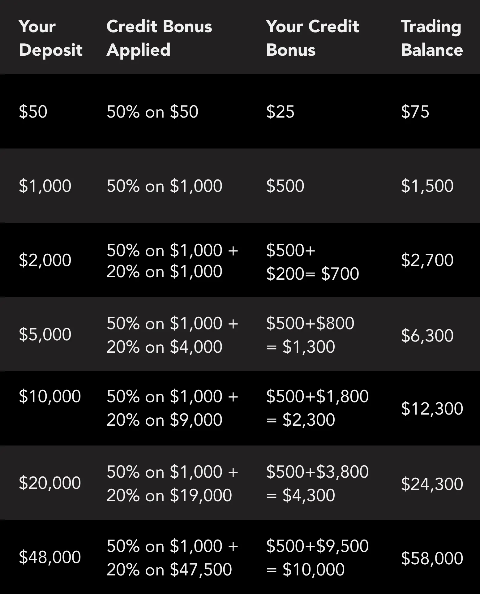3.If there are multiple trading accounts under the same client’s name, all eligible trading accounts can participate in this promotion, and the system will count the deposit and withdrawal of the account that has received the credit bonus. Based on the client’s ID, clients with the same name account can only redeem a maximum of 10,000 USD in credit (or currency equivalent) in total. (Note: For this promotion, customers can only apply for the “50% Deposit Bonus” once, and all subsequent deposits are only calculated according to the 20% ratio).